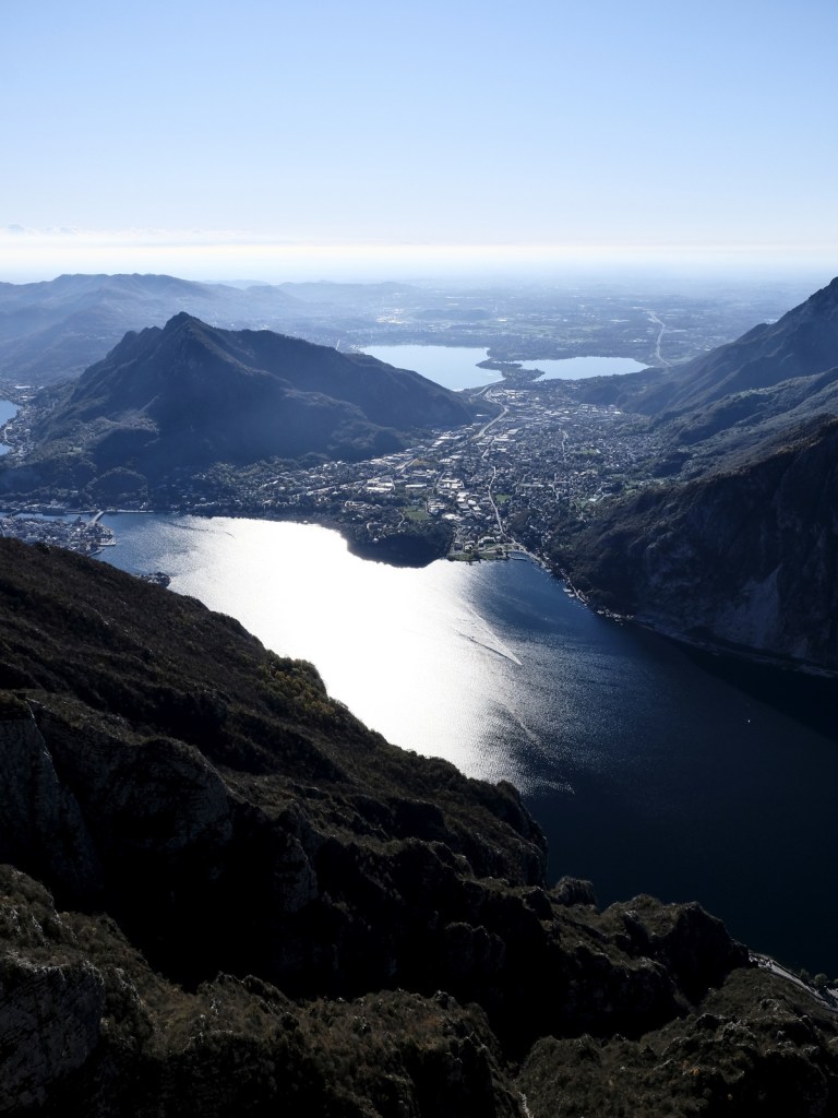 Papi, domenica andiamo a fare una gita alla terrazza dei Piani di Resinelli? Così ha esordito Eleonora, mia figlia, a metà novembre. Domenica 20 la gita ha preso forma. Partenza all’alba…o quasi (ore 10:20). Partecipanti: Eleonora, Cosmin, il suo ragazzo, la mia compagna Maria e io. Arrivo al parcheggio e passeggiata fino alla terrazza posta a 1400m s.l.m., una costruzione in acciaio a strapiombo sul lago con le montagne sullo sfondo. Per coloro che soffrono di vertigini è preferibile non camminare sulla passerella, in quanto sotto i piedi ci si trova solo una griglia che lascia intravedere il vuoto sottostante. Il panorama è mozzafiato. Abbiamo avuto la fortuna di scegliere una magnifica giornata, con il clima freddo al punto giusto per godere dell’escursione a tutto tondo. Immagino che, con altre condizioni climatiche, per esempio con la neve, al tramonto o all’alba, il panorama di cui si potrebbe godere sarebbe ancora più appagante. Pensiamoci…